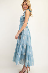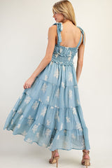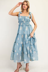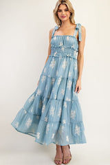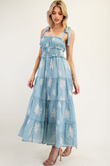 This enchanting maxi dress features a square neckline, adjustable tie shoulder straps, a smocked bodice with ruffle details, and a flowy tiered skirt adorned with intricate embroidered floral patterns, complete with a soft lining for added comfort and a polished finish. Model is 5'8" and is wearing a small.